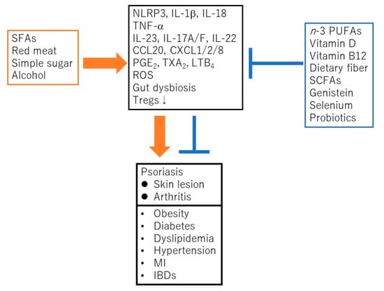 Saturated fatty acids (SFAs), red meat, simple sugars, or alcohol promote the development and progress of psoriasis and its comorbidities via the activation of nucleotide-binding domain, leucine-rich repeats containing family, pyrin domain-containing-3 (NLRP3) inflammasome cascade, TNF-α/IL-23/IL-17 axis, generation of reactive oxygen species (ROS), prostanoids/leukotrienes, gut dysbiosis, or suppression of regulatory T cells (Tregs). In contrast, n-3 polyunsaturated fatty acids (PUFAs), vitamin D, vitamin B12, dietary fibers, short chain fatty acids (SCFAs), genistein, selenium or probiotics ameliorate psoriasis or its comorbidities via the suppression of above inflammatory signaling pathways or the induction of Tregs. MI, myocardial infarction; IBD, inflammatory bowel disease; PGE2, prostaglandin E2; TXA2, thromboxane A2; LTB4, leukotriene B4.