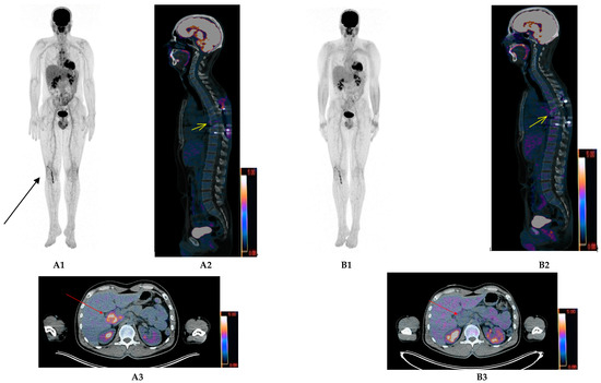 Finally, in the large international CASSIOPET study, a companion study of CASSIOPEIA [18], pre-maintenance complete metabolic response was defined as the residual tumor uptake < mediastinum blood pool background (Figure 2) and uncertain complete metabolic response as the residual tumor uptake <liver background. The preliminary results [19] show that of 184 patients with pre-maintenance PET results (101 treated with daratumumab+bortezomib/thalidomide/dexamethasone (D-VTd) and 83 by Vtd only), 118 (64.1%) achieved CMR, 47 (25.5%) uCR, 17 (9.2%) partial response (PR) and 2 (1.1%) stable disease (SD). D-VTd prolonged progression-free survival in the patients with PET pre-maintenance negativity. One hundred and two and 43 patients were MRD- (evaluated by MFC or NGS) and PET/CT-negative at MRD levels of 10−5 and 10−6, respectively. Concordance of the PET/CT and MRD results in ≥CR patients (PET-CR/MRD) identified 60 and 28 PET-CR-negative patients at 10−5 and 10−6 levels, respectively. Pre-maintenance double negativity rates for PET/CT and MRD were higher in D-VTd-treated patients compared to the Vtd patients (66.7% and 47.5% at 10−5 and 39.4% and 25.0% at 10−6, respectively). Because PET and MRD results are complementary, PET-CR/MRD negativity concordance may provide insight into using both methods as a predictive surrogate for patient outcome.