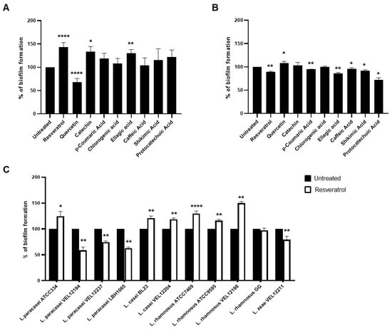 Low doses of polyphenols modulated biofilm formation of Lacticaseibacillus bacteria in a strain-dependent manner. (A) The ability of L. paracasei ATCC334 or (B) L. rhmanosus GG, untreated or incubated with 30 µM of the indicated polyphenols, to form biofilms was measured after 24 h culture on a polystyrene support by enumeration on Man-Rogosa-Sharpe medium (MRS) agar plates. Data are expressed as mean percentage ± standard error of the mean (SEM) of biofilm formation of at least three independent experiments, taken untreated bacteria value as 100%. * p < 0.05, ** p < 0.01 and **** p < 0.0001 (versus untreated). (C) The ability of a panel of Lacticaseibacillus strains belonging to the L. casei group (name indicated below the x-axis), untreated (black bars) or incubated with 30 µM of Resveratrol (white bars), to form biofilms was measured after 24 h culture on a polystyrene support by enumeration on MRS agar plates. Data are expressed as mean percentage ± SEM of biofilm formation of at least six independent experiments, taken untreated bacteria value as 100%. * p < 0.05, ** p < 0.01 and **** p < 0.0001 (versus untreated).