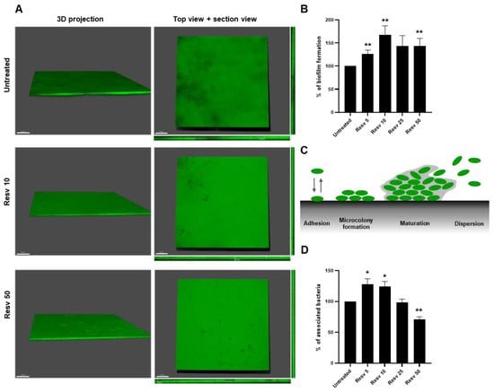 The human large intestine is covered with a protective mucus layer composed predominantly of mucins proteins secreted by goblet cells []. Thus, we used mucin-coated polystyren to mimic the intestinal intraluminal surfaces to visualize and to measure the ability of Resveratrol to enhance the biofilm formation by L. paracasei ATCC334 on a biotic surface during 24 h. We first visualized the formation of this biofilm by using the Syto9 probe, labelling all microorganisms in a population, and confocal laser scanning microscopy (Figure 2A). In the three conditions tested: untreated, Resveratrol 10 µM (Resv 10) and Resveratrol 50 µM (Resv 50), L. paracasei ATCC334 formed large flat biofilm structures, but biofilms formed upon Resveratrol treatment looks denser than those generated in the untreated condition (Figure 2A). To objectify these observations, we enumerated the number of living bacteria forming these biofilms at 24 h using the CFU assay. As shown in Figure 2B, a significant higher number of bacteria is retrieved from biofilm formed upon treatment with Resveratrol, with an effect peaking at a dose of 10 µM (167.8%), compared to those obtained from untreated bacteria (set as 100%). The formation of a biofilm can be schematically divided into four phases: (i) adhesion to the abiotic/biotic surfaces, (ii) microcolony formation corresponding to early development of a biofilm architecture, (iii) maturation of the biofilm and (iv) the dispersion (as depicted in Figure 2C) [].