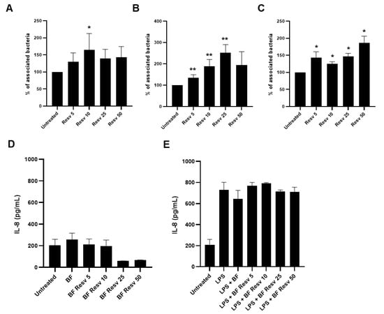 We next evaluated the effects of the same doses of Resveratrol on the ability of L. paracasei ATCC334 to adhere to two human intestinal epithelial cell (IEC) lines: HCT116 (Figure 3A) and HT29 (Figure 3B). For this purpose, Resveratrol was added to the cell culture medium of IECs, one-hour prior L. paracasei ATCC334 addition. In both cell lines, Resveratrol treatment significantly enhanced the adhesion of L. paracasei ATCC334, with a markedly higher effect for the adhesion to HT29 cells (Figure 3B). Interestingly, if the Resveratrol was added during the biofilm growth of L. paracasei, without addition of the polyphenols to host cells, the Resveratrol-treated bacteria remained able to better adhere to IECs compared to untreated bacteria, indicating that Resveratrol might act directly on bacteria to promote their adhesion (Figure 3C). Since an increase adhesion of bacteria to host cells might be detrimental by inducing a pro-inflammatory response [,], we checked whether Resveratrol, by promoting adhesion of L. paracasei to IECs, might trigger an exacerbated inflammatory response in basal condition (Figure 3D) or in inflammatory condition induced by a lipopolysaccharide (LPS) treatment (Figure 3E). Pro-inflammatory response was assessed by the measure, using ELISA assay, of the secretion of the prototypical pro-inflammatory cytokine IL-8 by HT29 IECs (Figure 3D,E). Interestingly, in basal condition, despite enhanced adhesion property to IECs, Resveratrol-treated L. paracasei ATCC334 did not induce more IL-8 upon challenge of IECs compared to untreated control bacteria (Figure 3). Similar observations were made under LPS-induced inflammatory response in HT29 (Figure 3E). Of note, we also checked whether the combination L. paracasei ATCC334 and Resveratrol did not induced an excerbated inflammatory response in immune cells by monitoring the secretion of the pro-inflammatory cytokine TNF-α, using the J774 macrophage cell line (Figure A4A,B).
