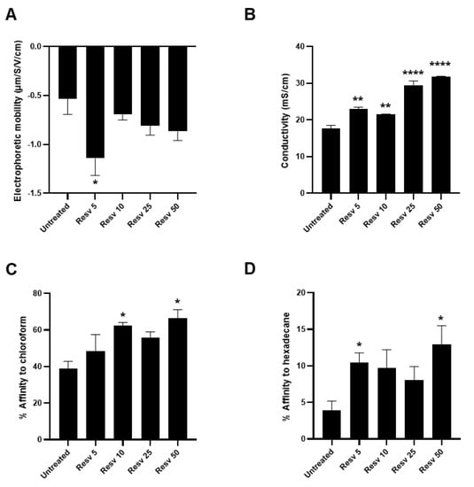 To elucidate the possible mechanism by which Resveratrol might enhance the adhesion properties of L. paracasei, and subsequent biofilm formation, we analyzed the surface properties of L. paracasei ATCC334 in basal condition and upon Resveratrol treatments. Indeed, the transition from a planktonic lifestyle to an attached state at a surface is a multifactorial process that is particularly determined by chemical and physical properties of the bacterial surface, that displays various electrical charges and hydrophobicity around the bacterial body depending on growth conditions []. Knowing the hydrophobic nature of Resveratrol and its ability to interact with numerous biological molecules [], it might affect surface properties of L. paracasei and thereby the interactions of the bacteria with biotic and abiotic supports. To verify this hypothesis, we first performed a global analysis of bacterial surface charges by an electrophoretic mobility assay. As shown in Figure 4A, a significant reduction in the electrophoretic mobility of L. paracasei was observed upon treatment with 5 µM Resveratrol (Resv 5) compared to the corresponding untreated bacteria. Even if nonsignificant, a similar trend was observed for higher doses of Resveratrol (Figure 4A). This negative shift in the electrophoretic mobility indicates that Resveratrol treatment increases negative charges at L. paracasei surface by revealing new functional groups such as carboxylates or sulfates. In addition, significant changes in conductivity were also measured in Resveratrol-treated bacteria, suggesting that Resveratrol modified their metabolism and the secretion of ions (minerals) which may contribute to the observed increase in the conductivity (Figure 4B).