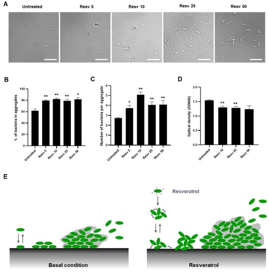The hydrophobicity of bacteria cell sufaces is also linked to aggregation, a bacterial lifestyle between the planktonic and biofilm states []. In addition, the formation of bacterial aggregates has been proposed to favor biofilm formation, notably by preparing bacteria to switching more rapidly to a biofilm-like phenotype []. To evaluate whether Resveratrol can promote L. paracasei aggregation, we treated for 1 h 30 min the L. paracasei ATCC334 strain with increasing doses of Resveratrol (from 5 to 50 µM) and proceeded directly to microscopic examination of the living cultures. As illustrated by representative micrographs of each condition in Figure 5A, Resveratrol treatments significanlty increased the number of L. paracasei bacteria forming aggregates (Figure 5B) and the size of these aggregates (Figure 5C). Aggregation of the bacteria upon Resveratrol treatment was confirmed by performing a sedimentation assay that consisted in measuring the evolution of turbidity during a short time (1 h 30 min) in a static culture []. Thus, if a treatment or a stress induced bacterial aggregation, a drop in optical density measured at 600 nm was observed, compared to those observed in a control culture. The significant reduction in turbidity at the top of the culture of Resveratrol-treated L. paracasei compared to the value obtained for untreated L. paracasei confirmed that aggregation occurred upon Resveratrol treatment (Figure 5D). To conclude, presumably as a consequence of the modification of L. paracasei surface properties (Figure 4), Resveratrol induced aggregation of L. paracasei and thereby might favor adhesion and biofilm formation (Figure 5E).