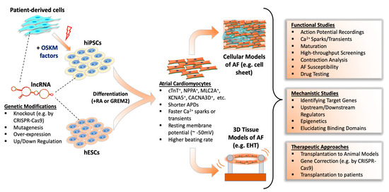 A large-scale evolutionary study showed that many lncRNAs have very limited sequential conservation unlike protein-coding counterparts [147]. Additionally, multidisciplinary analyses of lncRNAs from different species showed the vast majority of lncRNAs show minimal conservation [148]. Consequently, this limited conservation between species restricts the effective study of many lncRNAs in human AF. Also, the lack of a mechanistic understanding of AF development is an obstacle to understanding AF substrates. The most valid method is to obtain tissue samples from patients to study lncRNAs; however, there is a limited supply of these tissues from patients, let alone healthy individuals [149,150,151]. Therefore, the study of lncRNAs in AF are increasingly dependent on human pluripotent stem cell (hPSC)-derived atrial cardiomyocytes, which allows both large-scale experiments and genetic manipulation (Figure 1).