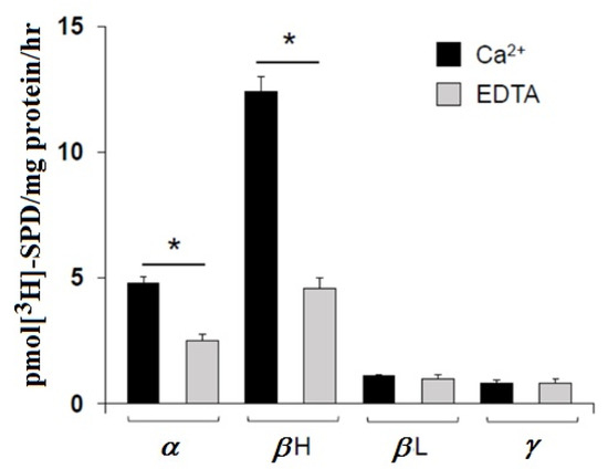 GPL-TG2-catalyzed incorporation of [3H]-SPD by rabbit eye lens crystallins separated by gel-permeation chromatography. Pellets derived from trichloroacetic acid (TCA)-precipitated protein were extensively washed, solubilized, and counted for radioactivity. EGTA incubation was used as a negative control. The data are expressed as the mean of three different determinations ± SD (* p < 0.05).