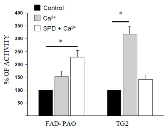 The activity of the two enzymes involved in the opacification of the rabbit lens (FAD-PAO and TG2) was evaluated under the two experimental conditions of lens culturing, i.e., in the presence of Ca2+ alone or the presence of Ca2+ and SPD. As shown in Figure 4, Calcium activated TG2, more than three times respect to the control, while the presence of SPD reduced the activity of this enzyme, probably due to competitive inhibition of this polyamine with the standard substrate. Furthermore, the increased levels of SPD in the lens culture medium enhanced the activity of the FAD-PAO by more than two times (Figure 4).