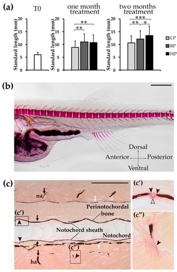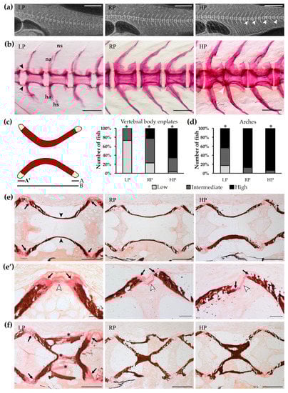 Zebrafish of 28 dpf (n = 8), one month treated (LP n = 51, RP n = 21, HP n = 31) and two month treated (LP n = 41, RP n = 48, HP n = 32) fish were euthanised by tricaine overdose, fixed for 24 h in 4% paraformaldehyde (PFA) in 1× phosphate-buffered saline (PBS) at 4 °C and were stained according to the following protocol: 1.5% H2O2 in 0.25% KOH (2 h); distilled H2O (dH2O) (5 min); 0.01% Alizarin red S in 0.5% KOH (12 h); 1% KOH (2 h); 25% glycerol in 0.75% KOH (2 h); 50% glycerol in 0.5% KOH (2 h); 75% glycerol in 0.25% KOH (2 h); 100% glycerol (modified from [100]). Fish were analysed and imaged using an Axio Zoom V16 stereomicroscope (Carl Zeiss, Oberkochen, Germany) with oblique illumination equipped with a 5MP CCD camera. Lateral images of stained fish were used to quantitatively analyse mineralisation levels of vertebral endplates. The vertebral body in the transition region, described as the first caudal vertebra possessing elongated unfused haemal arches, drastically shortened ribs and absence of haemal spine [40], was considered for measuring the total vertebral length and the non-mineralised endplate length. Endplates represent the growth zone of vertebral centra, where the newly formed bone is deposited. Thus, endplates provide a valuable location to characterise bone formed during the dietary treatment. The non-mineralised endplate was expressed as a percentage of the total non-mineralised endplate length over the total vertebral length: (A + A’)/B (Figure 2c). Vertebral endplates with a non-mineralised percentage value greater than 10% were classified as low-mineralised, between 3% and 10% as intermediate mineralised, and less than 3% were considered fully mineralised. Fin rays were classified as low-mineralised if more than two segments were non-mineralised, intermediate mineralised if one or two segments were non-mineralised and fully mineralised if all segments were mineralised. Mineralisation levels of neural and haemal arches and dorsal and anal pterygiophores were qualitatively evaluated as low, intermediate or high depending on Alizarin red S distribution in the bone (Supplementary Figure S1).
