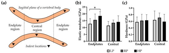 High dietary P is associated with higher stiffness in the bone formed after two months of treatment. (a) Schematic representation of nanoindentation measurements in the sagittal plane of a vertebral body. (b) In the endplates, the elastic modulus as indicator for stiffness shows significantly higher values in HP compared to LP (*: p = 0.004), and a trend towards higher values in HP compared to RP (p = 0.073). In the central region, all dietary groups showed similar values. (c) The hardness of the vertebrae was similar in all dietary groups in both the endplates and central regions.