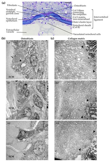 Histological analysis showed that, in all dietary groups, intervertebral spaces are unaltered with normal intervertebral ligaments. The vertebral endplates are fully elongated without any malformation. Numerous osteoblasts are present in the growth zone of the vertebral body endplates (Figure 6a). Transmission electron microscopy of representative specimens confirmed the presence of active osteoblasts in all dietary groups. All osteoblasts are characterised by a high number of endoplasmic reticulum (ER) cisternae. In the osteoblasts of the LP individual, ER cisternae are enlarged compared to the RP and HP individuals, indicative of increased cellular activity (Figure 6b).