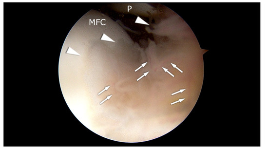 Arthroscopic appearance of the patient with synovitis and initial pathologic changes in the cartilage of the medial femoral condyle (MFC). Arrowheads: hypertrophic synovium. MFC: cartilage of the medial femoral condyle. P: patella. Arrows: blood vessels. The picture comes from our own material.