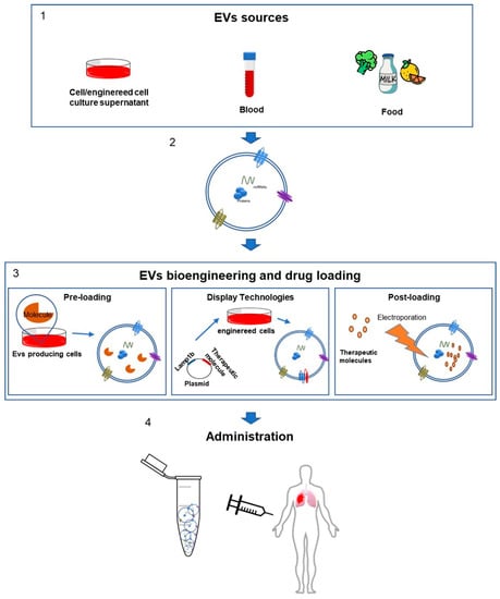 A possible approach consists of the isolation and engineering of cells from the patient, starting from body fluids [,] or from various foods including milk, fruits and vegetables [,]. Therapeutic compounds can be loaded within these EVs and infused into the patient.