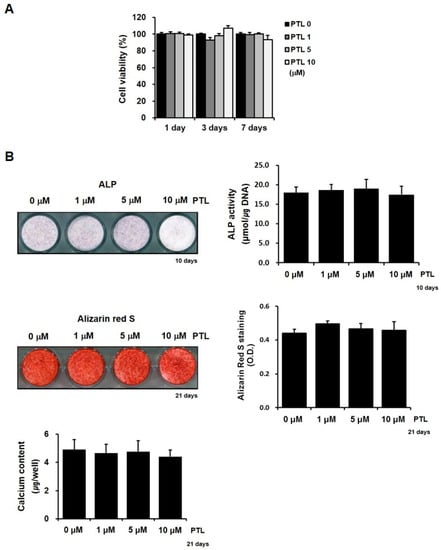 PTL has no significant effects on hPDCs in vitro. There was no significant effect of PTL on the cell viability of hPDCs (A). PTL also did not clearly affect the in vitro osteoblastic differentiation of hPDCs, regardless of concentrations (B).