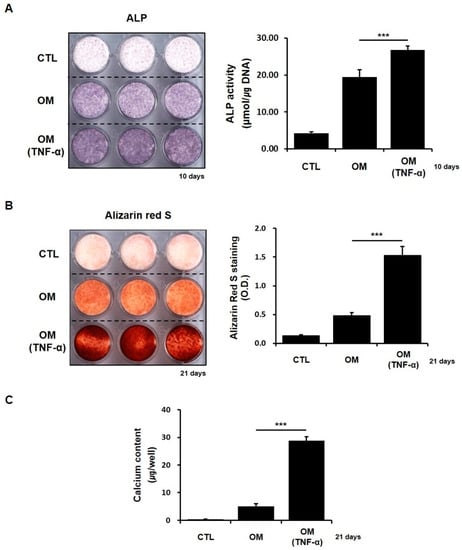 Treatment with 10 ng/mL TNF-α significantly increased the histochemical detection and activity of ALP in hPDCs (A). Alizarin red-positive mineralization and calcium contents also increased in hPDCs treated with 10 ng/mL TNF-α (B,C, respectively). CTL, control DMEM; OM, osteogenic induction medium. *** p < 0.001.