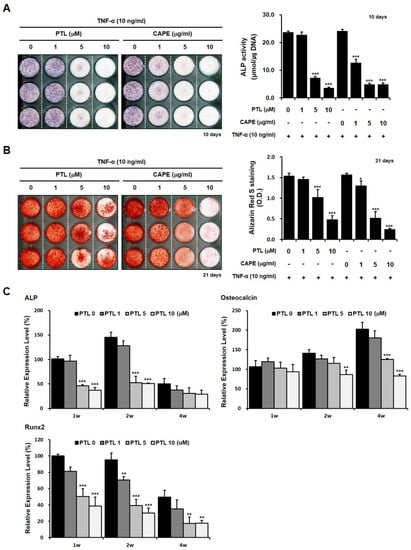 We next examined the effects of PTL on the in vitro osteoblastic phenotypes of hPDCs treated with TNF-α. Although treatment with 1 µM PTL did not affect the histochemical detection and activity of ALP in TNF-α-treated hPDCs, treatment with 5 and 10 µM PTL significantly decreased ALP expression and activity in TNF-α-treated hPDCs. Caffeic acid phenethyl ester (CAPE), used as a positive control, also decreased the histochemical detection and activity of ALP in these cells (Figure 3A). Similarly, although treatment with 1 µM PTL did not decrease the quantification of alizarin red-positive mineralization in hPDCs treated with TNF-α, the alizarin red-positive mineralization was decreased in cells pretreated with 5 and 10 µM PTL, in a concentration-dependent manner. CAPE also decreased alizarin red-positive mineralization, in a dose-dependent manner (Figure 3B). CAPE appeared to reduce ALP activity and alizarin red-positive mineralization to a slightly greater extent than PTL in hPDCs treated with TNF-α.