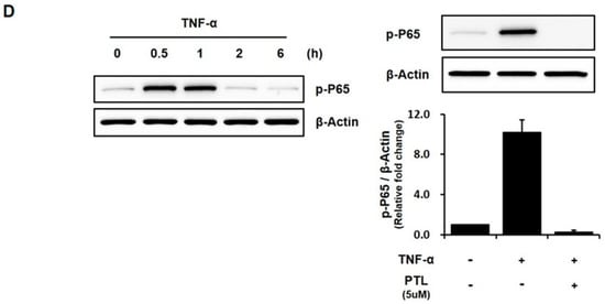 We also examined the role of PTL as the inhibitor of NF-κB signaling by Western blotting for the detection of phosphorylation of p65. p65 is one of the five components that form the NF-κB transcription factor family. The phosphorylation of p65 was highly expressed in hPDCs treated with TNF-α. In addition, PTL dramatically blocked the p65 phosphorylation in hPDCs treated with TNF-α (Figure 3D). These results suggest TNF-α activated NF-κB signaling and PTL functions as an inhibitor of NF-κB.