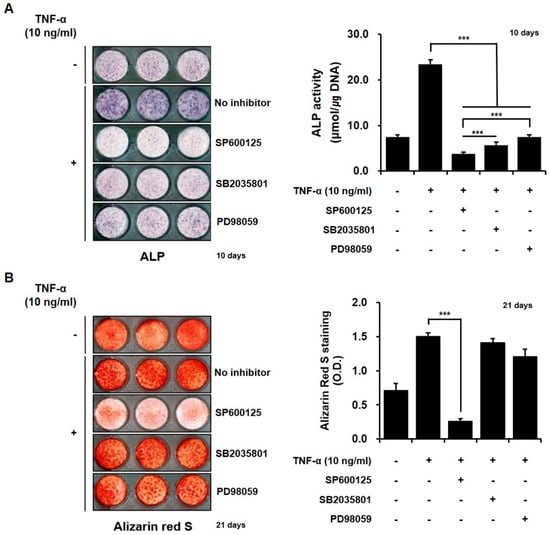 Effects of MAPKs on the in vitro osteoblastic differentiation of hPDCs treated with TNF-α. ALP activity decreases in hPDCs pretreated with all three MAPK inhibitors (A). SP 600125 shows the most potent inhibition of ALP activity, among all tested MAPK inhibitors. In line with the ALP results, alizarin red-positive mineralization was significantly decreased in hPDCs pretreated with the JNK-specific inhibitor (B). *** p < 0.001.