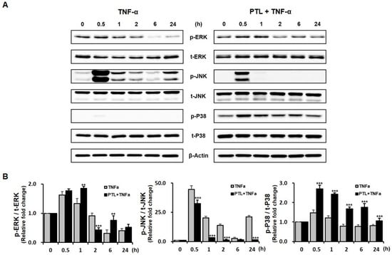 Effects of PTL on TNF-α-induced MAPK activation in hPDCs. TNF-α stimulated the phosphorylation of ERK and JNK in hPDCs, whereas pretreatment with PTL enhanced ERK and p38 phosphorylation in TNF-α-treated hPDCs. The effects of PTL on JNK phosphorylation were transient, at 0.5 h, in the TNF-α-treated hPDCs (A). The quantification of the Western blot was performed to determine the relative phosphorylation ratio of the MAPK pathway in hPDCs, which showed that the relative phosphorylation ratio of JNK was significantly decreased in TNF-α-treated hPDCs pretreated with PTL, whereas the relative phosphorylation ratio of p38 MAPK increased in cells pretreated with PTL. The phosphorylation of ERK significantly increased after 1 and 6 h, although it decreased at 2 h following pretreatment with PTL (B) ** p < 0.01, *** p < 0.001.