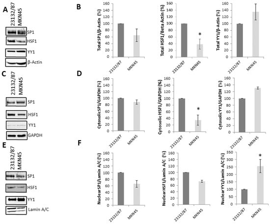 Analysis of total, cytosolic and nuclear levels of transcription factors SP1, HSF1 and YY1 in 23132/87 and MKN45 cell lines. Representative western immunoblots (n = 3) performed using total (A), cytosolic (C) and nuclear (E) lysates, which were obtained from 23132/87 and MKN45 cells. Quantities of 15 µg of total or cytosolic cellular proteins and 7.5 µg of nuclear proteins were loaded and probed with antibodies specific for SP1, HSF1 and YY1. Blots were reprobed with antibodies against proteins used as a loading control: anti-β-Actin for total extracts, anti-GAPDH for cytosolic extracts and anti-Lamin A/C for nuclear extracts. Quantification (B,D,F) of SP1, HSF1 and YY1 levels in 23132/87 and MKN45 samples was performed with Image Lab analysis software version 5.2.1. The values obtained from the ratio between SP1, HSF1 and YY1 signals and the loading control β-Actin (B) or GAPDH (D) or Lamin A/C (F) in MKN45 cells were calculated and compared with the values obtained in 23132/87 cells, set as 100%; * p < 0.05.