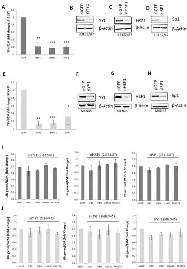 siRNA-mediated knockdown of YY1, HSF1 and SP1 transcription factors and Ub gene expression levels after RNA interference treatments in the 23132/87 and MKN45 cell lines. 23132/87 (A) and MKN45 (E) cells were transiently transfected with YY1, HSF1, SP1 and control GFP siRNAs. At 48 h after transfection, the mRNA levels of the target genes were measured by real-time quantitative PCR, normalized to B2M mRNA and depicted as fold change compared with siGFP transfected cells. Data are means ± SD (n = 3); * p < 0.05, ** p < 0.01, *** p < 0.001. Representative western immunoblots of total proteins from 23132/87 (B–D) and MKN45 (F–H) cells transfected with either control (siGFP) or YY1, HSF1 or SP1 siRNAs, at 48 h post-transfection (n = 3). A quantity of 15 µg of total cellular proteins was loaded and probed with antibodies specific for YY1 (B,F), HSF1 (C,G) or SP1 (D,H); blots were reprobed with anti-β-Actin, used as a loading control. 23132/87 (I) and MKN45 (J) cells were transiently transfected with YY1, HSF1, SP1 and control GFP siRNAs. After 48 h, the mRNA levels of UBC, UBB, UBA52 and RPS27A genes were measured by real-time quantitative PCR, normalized to B2M mRNA and depicted as fold change compared with siGFP transfected cells, set as 1. Data are means ± SD (n = 3).