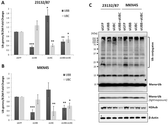 siRNA-mediated knockdown of UBB and UBC in 23132/87 and MKN45 cell lines. 23132/87 and MKN45 cells were transiently transfected with either control GFP or UBB, UBC or UBB+UBC siRNAs. At 48 h after transfection, the mRNA levels of UBB and UBC for 23132/87 (A) and MKN45 (B) were measured by real-time quantitative PCR, normalized to B2M mRNA and depicted as fold change compared with siGFP transfected cells, set as 1. Data are means ± SD (n = 3); * p < 0.05, ** p < 0.01, *** p < 0.001. (C) Representative western immunoblots (n = 2) of total protein lysates (5 μg) of 23132/87 and MKN45 cells obtained 48 h after transfection with siGFP (control), siUBB, siUBC and siUBB+siUBC. The samples were loaded and probed with anti-Ub antibody to detect the conjugated and mono-Ub pools (the latter were analyzed using the light exposure image). Blots were reprobed with anti-H2Aub and anti-β-Actin antibody, used as a loading control. Brackets indicate Ub conjugates. Arrowheads on the left indicate the molecular weight standards.