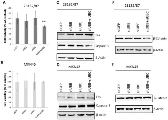 MTS (3-(4,5-dimethylthia-zol-2yl)-5-(3-carboxymethoxyphenyl)-2-(4-sulfophenyl)2H- tetrazolium) assay for 23132/87 and MKN45 cells and evaluation of apoptotic and pro-survival markers. Cell viability of 23132/87 (A) and MKN45 (B) cells transiently transfected (48 h) with either siGFP (control) or with UBB, UBC or UBB+UBC siRNAs was evaluated via MTS assay (n = 8) and shown as a percentage with respect to the siGFP transfected cells, set as 100%; ** p <0.01. (C,D) Representative western immunoblots of total proteins from 23132/87 (C) or MKN45 (D) cells transfected as in (A,B), respectively (n = 3). A quantity of 15 µg of total cellular proteins was loaded and probed with antibodies specific for Fas or Caspase 3; blots were reprobed with anti-β-Actin, used as a loading control. (E,F) Representative western immunoblots of total proteins from 23132/87 (E) or MKN45 (F) cells transfected as in (A,B), respectively (n = 2). A quantity of 7.5 µg of total cellular proteins was loaded and probed with the antibody specific for β-catenin; blots were reprobed with anti-β-Actin, used as a loading control.