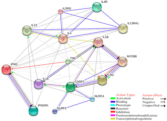 Interaction among IFN-γ, TLR2, CASP1, TNFα and IL-4 that may have effect on inflammasome assembly and activation during tick-borne pathogens infection.