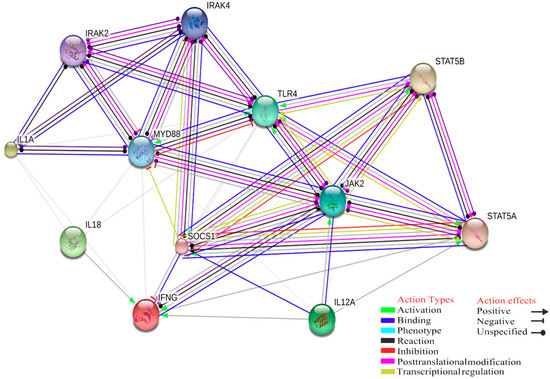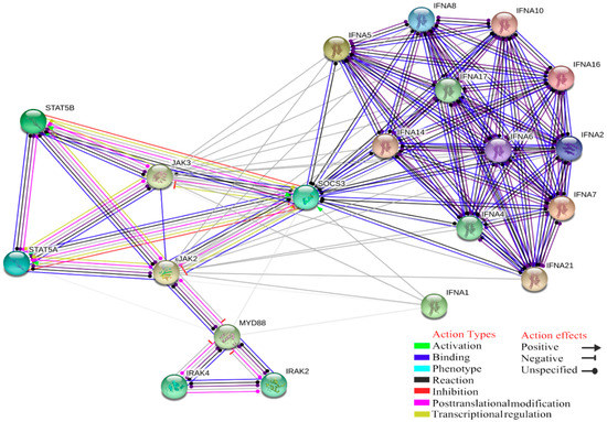 Another essential role of MyD88 and the JAK-STAT pathways is linked to IFN-α (IFNA1, IFNA4, IFNA5, IFNA6, IFNA7, IFNA8, IFNA10, IFNA14, IFNA16, IFNA17, IFNA20, IFNA21). These genes are linked with a biological function known as natural killer cell activation that is involved in immune response and positive regulation of IFN-γ due to NK activated by specific antigens or mitogens, displaying antiviral activity (GO:0002323, raw p-value = 7.23 × 10−23, FDR = 6.77 × 10−21; Figure 4).