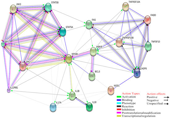 Moreover, our gene interactions study showed that IL-12, STAT5A and STAT5B have a negative inhibition on IL-17 and positive activation on FAS (TNF receptor superfamily, member 6), which consequently leads to activation of CASP8, apoptosis-related cysteine peptidase (significant score: 0.567) (Figure 5).
