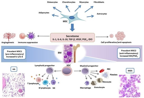 Multiple functions of mesenchymal stem cells in aplastic anemia and myelodysplastic syndromes. Mesenchymal stem/stromal cells (MSCs) are multipotent cells that are able to differentiate and transdifferentiate in different tissues (e.g., bone, cartilages, adipose tissue). They exert a supportive and modulating effect on the bone marrow (BM) niche and on innate and adaptive immunity via the secretion of soluble mediators (secretome). Various MSC alterations are described in AA and MDSs, including increased immunosuppression, decreased angiogenesis (prevalent in the former) and deregulated proliferation/apoptosis (prevalent in the latter). These phenomena may be mirrored by a phenotypic shift from type 1 (proinflammatory/immunosuppressive) to type 2 (anti-inflammatory/tumor-educated) MSCs along the clinical spectrum of BM failure syndromes. IL-1, interleukin-1; IL-6, interleukin-6; IL-10, interleukin-10; TGF−β, transforming growth factor-β; PGE2, prostaglandin E2; IDO, indoleamine 2,3-dioxygenase; MSC 1/2, type 1/2 MSC; HSC, hematopoietic stem cell; NK, natural killer; RBC, red blood cell.