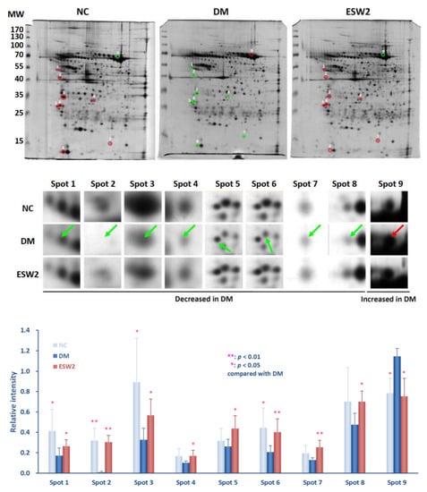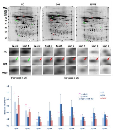 Protein spots of taking into consideration in 2D gel electrophoretograms of peri-wounding skin tissue proteins acquired from day 10 after two sessions of ESWT (ESW2), normal controls (NC), a diabetes controls (DM) at the same days. (Above) Representative 2D gel electrophoretograms of peri-wounding skin tissue proteins. The skin tissue protein samples (150 µg) were exposed to isoelectric focusing (pH 4 to 7), SDS-PAGE, and silver staining. The numbers on the left demonstrate the molecular weight (MW), in kilodaltons. (Center) Enlarged fields of the 9 spots of interest in the sliver-stained SDS-PAGE gels. The spots in the gels of NC, DM, and ESW2 were coordinated utilizing Bio-Rad Proteoweaver 2-D Analysis Software Version 4.0. The arrows prevail upon the spots of interest. (Below) Relative densities of the emphatically distinguished proteins. Relative intensity was determined by separating the thickness of coordinated spots by the thickness of all the coordinated spots in the individual gel. Abbreviation: ESWT, extracorporeal shock wave therapy.