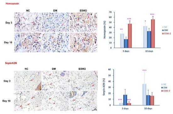 Hemopexin and serine protease inhibitor (SERPIN) A3N expression of peri-wounding tissue samples were analyzed by using immunohistochemical staining at day 3 among extracorporeal shock wave therapy (ESWT), normal controls (NC), and diabetic control (DM) groups. The original magnification is 400× and representative microscopic fields are shown. (Above) Cells positively stained for hemopexin antibody are also shown. *** p < 0.001. (Below) Cells positively stained for serine protease inhibitor A3N antibody are also shown. * p < 0.05. ** p < 0.005. *** p < 0.001.