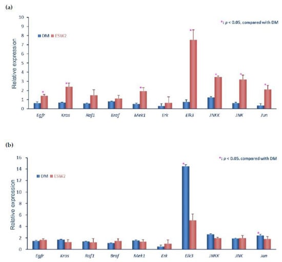 The results showed higher gene levels of Egfr, Kras, Mek1, Elk3, Jun, Jnk, and Jnkk at the beginning time (three days) in the ESWT group, when contrasted with that in diabetic rats (Figure 4a). However, the upregulation of Kras, Mek1, Elk3, Jnkk, Jnk, and Jun was strongly suppressed at the late stage (10 days) in ESWT rats, particularly the expression of Elk3 was reversed as compared to that in diabetic rats (Figure 4b). These results indicated EGF initiation of the Raf-MEK-ERK signaling is engaged with ESWT enhanced diabetic wound healing.