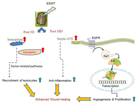 In summary, our proteomic study of topical wound edge protein expressions reveals ESWT improving chronic wound healing involves in neo-angiogenesis and anti-inflammation. The modulation of hemopexin and serpin-related pathways will be a good strategy to promote wound healing (Figure 5).