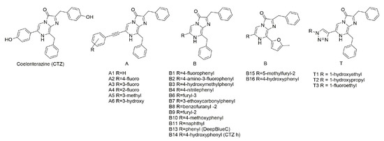 Recently, a series of novel coelenterazine analogues with different substituents at positions C-2, C-6, and C-8 of the imidazopyrazinone core have been synthesized (Figure 1) [15,16]. These compounds were tested with coelenterazine-dependent recombinant luciferases from the soft coral Renilla reniformis (RLuc) and the copepod Gaussia princeps (GLuc). Some of these analogues revealed promising properties as the substrates of these luciferases as compared to DeepBlueC™ or native coelenterazine in both in vitro and in vivo experiments.