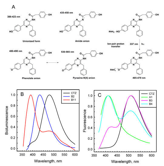 Fluorescent emitters of coelenteramide [30] (A), bioluminescence (B), and fluorescence (C) spectra of obelins activated with native coelenterazine and some coelenterazine analogues.