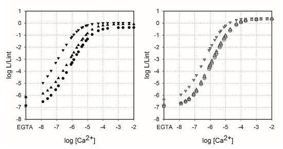 Measurements were performed in EDTA-free solutions of the photoproteins. For the 10−6 to 10−2 M [Ca2+] range, simple dilutions of CaCl2 were used and for Ca2+ concentrations below 10−6 M the Ca-EGTA buffers (total [EGTA] = 2 mM) were used. The Ca2+ buffers were prepared by the two stock-solution method described elsewhere [50]. Peak light intensity (L) was measured after the injection of 10 μL of photoprotein solution into 1 mL of the test solution. All measurements were carried out at 20 °C using a luminometer equipped with a temperature-stabilized cuvette block and neutral density filters with different transmission coefficients to fit light signals from low to saturated calcium concentrations ranging over 6–7 log units. Ca2+ concentration-effect curves were presented as L/Lint vs. [Ca2+], where L is the peak bioluminescence intensity for a given [Ca2+] value and Lint is the total bioluminescence recorded for a saturating Ca2+ dose for the same sample [39].