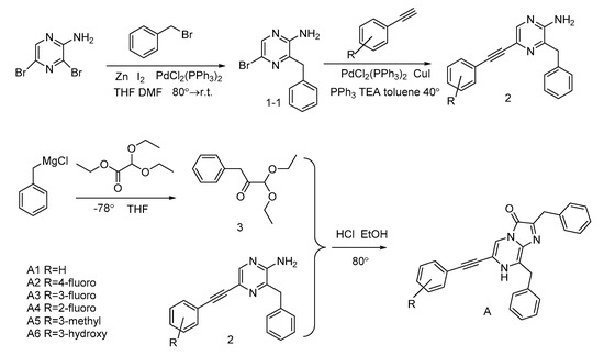 For most of CTZ analogues, substituents on the C-6 phenyl ring of coelenterazine were introduced by first preparing 2-amino-3-benzyl-5-bromopyrzine (1-1) via regioselective palladium-catalyzed Neigishi-type cross-coupling of benzylzinc bromide and 2-amino-3,5-dibromopyrazine. For the A-series CTZ analogues [15] (Figure 4), key precursors 2 were obtained with a good yield via Sonogashira coupling reactions with substituted phenylacetylene.