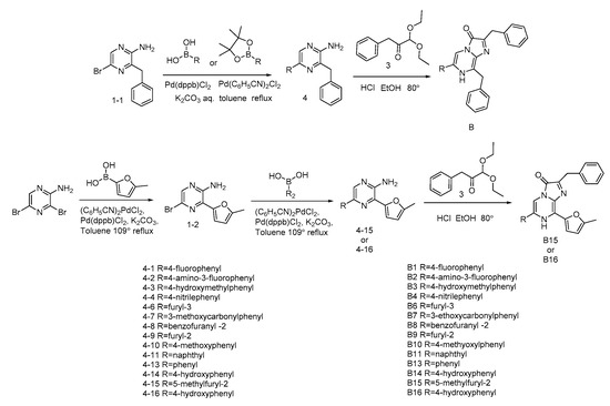 For the B-series CTZ analogues [16] (Figure 5), the key intermediates 4 were synthesized with good to moderate yields by Suzuki coupling reaction with the appropriately substituted arylboronic acid. However, compounds 4-15 and 4-16 were generated from compound 1-1 and substituted arylboronic acid using two sequential Suzuki coupling reactions.