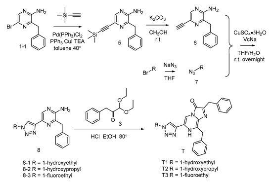 For the T-series CTZ analogues (Figure 6) [15], the compound 1-1 underwent a Sonogashira coupling reaction with trimethylsilylacetylene and then became 2-amino-3-benzyl-5-ethynyl-pyrazine (6) by removing the trimethylsilyl group. Then, the key precursors 8 were synthesized using a click reaction of the compound 6 and azides.