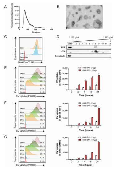 Together, these results indicate that EVs isolated from 143-B cells were of a high purity and were consistent with the size, structure and molecular characteristics of exosomes, as described in the literature. Moreover, osteosarcoma cell-derived EVs are efficiently taken up by stromal cells.