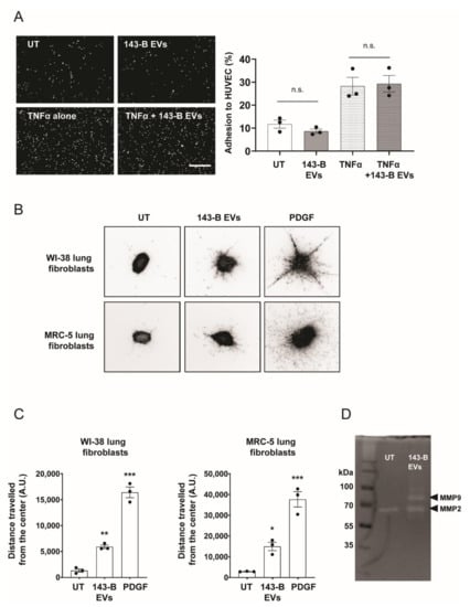 Functional consequences of 143-B EV treatment of endothelial cells and lung fibroblasts. (A) Representative images (left panel) and quantification (right panel) of 143-B cell adhesion to HUVEC monolayers. Fluorescently labelled tumor cells were allowed to adhere for 15 min to HUVEC cells left untreated (UT) or treated for 12 h with 143-B-derived EVs (20 μg/mL) in the presence or absence of TNFα (10 ng/mL). Scale bar, 500 µm. n.s., not significant. (B) Representative images of the spheroid invasion assay with WI-38 and MRC-5 fibroblasts after 48 h of incubation with 143-B EVs (20 μg/mL) or platelet-derived growth factor (PDGF) (20 ng/mL) and (C) the quantification of distances from spheroids centers using cell dissemination counter software aSDIcs (right panels); (* p < 0.05, ** p < 0.01, *** p < 0.001, one-way ANOVA with Bonferonni’s post hoc test). (D) Zymography analysis of MMP-2 and MMP-9 activity in untreated MRC-5 fibroblasts or treated with 143-B-derived EVs (20 μg/mL) for 48 h. Values in (A) and (C) represent the means ± SEM from three independent experiments.