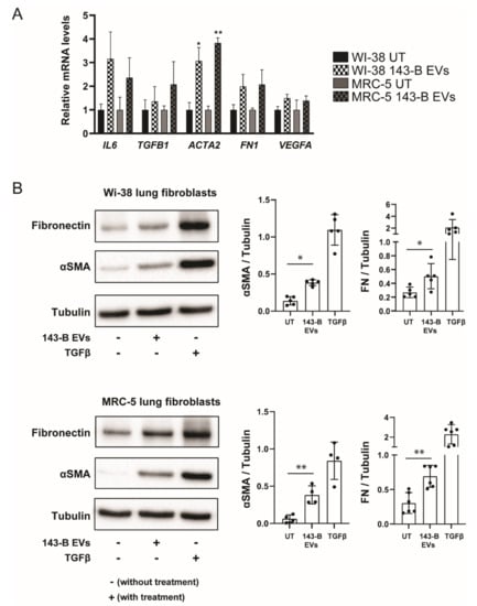 143-B EVs induce lung fibroblast differentiation in vitro. (A) Relative mRNA expression levels of indicated genes in lung fibroblasts following incubation with 143-B-derived EVs (20 μg/mL) for 24 h. Transcript levels are normalized to glyceraldehyde 3-phosphate dehydrogenase (GAPDH) and expressed as fold change relative to the untreated control (UT). At least three independent experiments were performed (* p < 0.05, unpaired Student’s t-test). (B) Fibronectin and α-smooth muscle actin (αSMA) protein levels in whole cell extracts of lung fibroblasts treated with 143-B-derived EVs (20 μg/mL) or soluble transforming growth factor β1 (TGFβ1) for 48 h were examined by Western blot analysis. Tubulin was used as a protein loading control. Representative Western blots (left panels) and respective quantitative analysis of at least three independent experiments (right panels) (* p < 0.05, * p < 0.01, unpaired Student’s t-test) are shown.