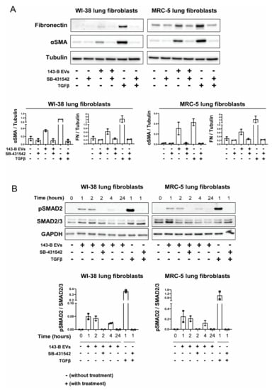 Osteosarcoma cell-derived EVs trigger αSMA expression in lung fibroblasts through TGFβ. (A) Western blot analysis of fibronectin and αSMA protein expression in WI-38 and MRC-5 fibroblasts upon exposure to 20 μg/mL 143-B-derived EVs and 10 ng/mL of soluble TGFβ1 for 48 h with or without pre-treatment with a TGFβ receptor 1 inhibitor SB-431542 (10 μM) for 30 min. (B) Effects of 143-B EVs on SMAD2 phosphorylation in lung fibroblasts. Serum-starved (24 h) WI-38 and MRC-5 cells were left untreated or were pre-treated for 30 min with SB-431542 (10 μM) prior to incubation with 143-B EVs (20 μg/mL) or TGFβ1 (10 ng/mL) for the indicated periods of time. Protein expression of phosphorylated SMAD2, total SMAD2/3 and GAPDH was evaluated by Western blot. Representative Western blots (upper panels) and respective quantitative analysis of two independent experiments (lower panels) are shown.