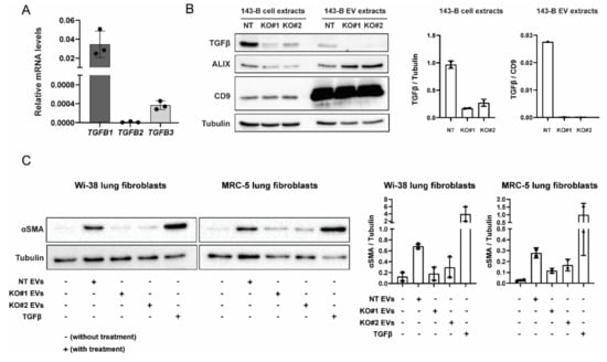 CRISPR-Cas9-mediated knockout of TGFB1 prevents 143-B-derived EVs from inducing lung fibroblast differentiation. (A) mRNA expression levels of indicated TGFβ isoforms (relative to GAPDH) in 143-B osteosarcoma cells as determined by qRT-PCR. (B) Western blot analysis of TGFβ1 protein expression was used to validate the efficiency of CRISPR-Cas9-mediated genome editing in non-targeting control (NT) 143-B, TGFβ1 KO#1 143-B, and TGFβ1 KO#2 143-B cell extracts and, respectively, derived-EV protein extracts. Cell extracts were harvested 4-5 passages after the initial viral transduction. Protein levels of EV markers (CD9 and ALIX) were examined by Western blot. (C) Western blot analysis of αSMA expression in WI-38 fibroblasts and MRC-5 fibroblasts following 48 h incubation with 20 μg/mL of EVs derived from control NT 143-B cells, TGFβ1 KO#1 143-B cells and TGFβ1 KO#2 143-B cells. Soluble TGFβ (10 ng/mL was used as the positive control. Tubulin was use as a loading control. Representative Western blots (left panels) and respective quantitative analysis of two independent experiments (right panels).