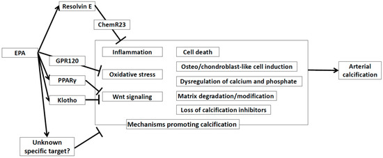 In human aortic smooth muscle cells, activation of Wnt signaling induces the expression of osteogenic genes [78,108]. EPA suppresses not only the expression of these osteogenic genes but also the expression of Wnt signaling marker genes via upregulation of peroxisome proliferator-activating receptor gamma (PPARγ) [78]. PPARγ activates secreted frizzled-related protein 2 (SFRP2) and counteracts vascular calcification induced by Wnt5a in mice [109]. Additionally, EPA upregulates Klotho in the kidney [78].