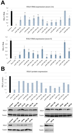We used three commonly used tools for predicting miRs: miRanda (August 2010 release), TargetScan (released 7.1, June 2016), and MicroT-CDS (version 5.0, updated July 2012). For miRanda [78], we used human target site predictions with good mirSVR scores and conserved miR. The scale values ≤ 0.1 predicted a higher possibility of RSU1-targeting. For TargetScan [79], Context+++ score is to be most negative and the Context score and pCT (probability of conserved targeting) were used to evaluate the probability of a miR to bind 3′-UTR of RSU1. For microT-CDS [80], we used the gene symbol “RSU1”, species “Homo sapiens”, gene ID “ENSG00000148484”. The results were evaluated using the miTG score; 0.7–1 or 0–1 scores predict a higher possibility of targeting in the case of the miTG score.