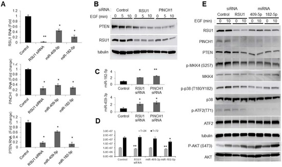 As previously reported, the siRNA-mediated depletion of either RSU1 or PINCH1 reduced PTEN protein expression (Figure 3B) [11]. The transfection of miR-409-5p or miR-182-5p into MCF10A cells targeted RSU1 and PINCH1 (Figure 3E). It also reduced phospho-MKK4, phospho-p38, phospho-ATF2 and PTEN, and increased the phosphorylation of AKT. The changes in the components of the signaling pathwaym resulting from miR-409-5p and miR-182-5p transfection, are comparable to those in cells transfected with RSU1 siRNA. Hence, this suggests that the transfection of miR-182-5p and miR-409-3p reduces the levels of RSU1 and PINCH1 and inhibits MKK4-p38-ATF2-PTEN (Figure 3E). Viability studies indicate that RSU1 depletion transiently inhibits viability, but that miR-182-5p expression inhibited growth for the course of the experiment (Figure 3D).