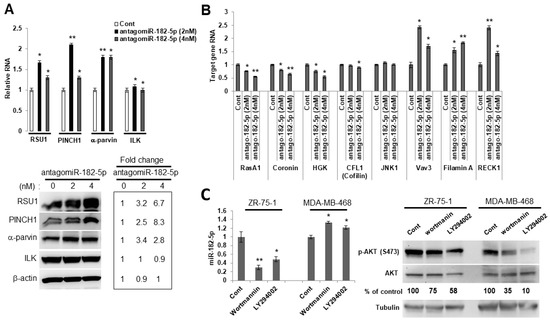 Using another approach to examine the ability of miR-182-5p to regulate RSU1, we chose a cell line with high levels of miR-182-5p expression which could be reduced by an antagomir. The luminal breast cancer cell line, ZR75-1, has a PTEN mutation and constitutively elevated levels of phospho-AKT, and high levels of miR-182-5p are detected in these cells. The transfection of the antagomir to reduce miR-182-5p levels increased RSU1 RNA and protein, as well as PINCH1 and another known miR-182-5p target, α-parvin (Figure 4A), while the expression of ILK was not significantly changed. Furthermore, the expression of additional known targets of miR-182-5p, i.e., VAV3, FLNA (Filamin A) and RECK1, were elevated following a transfection of the antagomiR-182-5p into ZR75-1 cells (Figure 4B). Since the phospho-AKT levels and miR-182-5p expression are high in ZR75-1 cells, we examined the impact of the PI3K/AKT signaling pathway on the expression of miR-182-5p. We treated luminal ZR75-1 and basal MDA-MB-468 cells, which also exhibit constitutive high levels of phospho-AKT, with PI3K inhibitors. Using either wortmannin or LY294002 to inhibit the activation of AKT, the miR-182-5p expression was suppressed in the luminal ZR75-1, but not in basal cell line MDA-MB-468 (Figure 4C), suggesting that AKT signaling regulates miR-182-5p in ZR75-1 cells but not in the basal MDA-MB-468 cells.