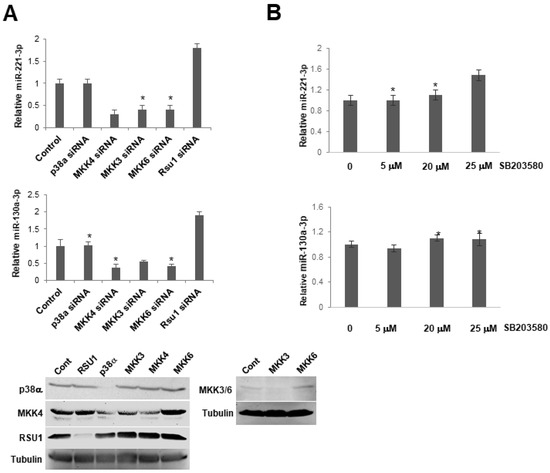 p38 MAPK activation does not regulate the expression of miR-130a-3p and miR-221-3p in MCF7 cells. (A). The expression level of miR-221-3p and -103a-3p was measured by TaqMan real-time PCR following the transfection of siRNAs for p38α MAPK, MKK4, MKK3, MKK6 into MCF7 cells. Values represent the means from triplicate samples ± S.D. * p < 0.05 versus control and control siRNA levels were set to 1. Western blot analysis shows the depletion of p38, MKK4, MKK3, 6 by siRNA in these cells. (B). MCF7 cells were pretreated with a p38 MAPK inhibitor, SB203580, for 1 h. The expression level of miR-221-3p and -103a-3p was measured by TaqMan real-time PCR. The expression level of miRs was normalized to the expression of by RNU6B, small nuclear RNA. Values represent means ± S.D. * p < 0.05 versus control. Control DMSO pretreatment levels were set to 1.