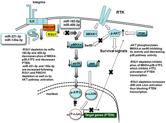 Schematic summary of the miR-targeting of RSU1. RSU1 depletion by miRs-182-5p and -409-3p decreases the phosphorylation of MKK4-p38-ATF signaling. miRs-221-3p and -130a-5p target RSU1 and PINCH1 and are increased by RSU1 and PINCH1 depletion. RSU1 plays an important role for the transcriptional regulation of the PTEN gene through the regulation of the promotor binding factors ATF2 or cJun, which are dependent on upstream activation by p38 MAPK and JNK, respectively. The active AKT phosphorylates MKK4 at ser80 and suppresses its activity and downstream p38 MAPK signaling.